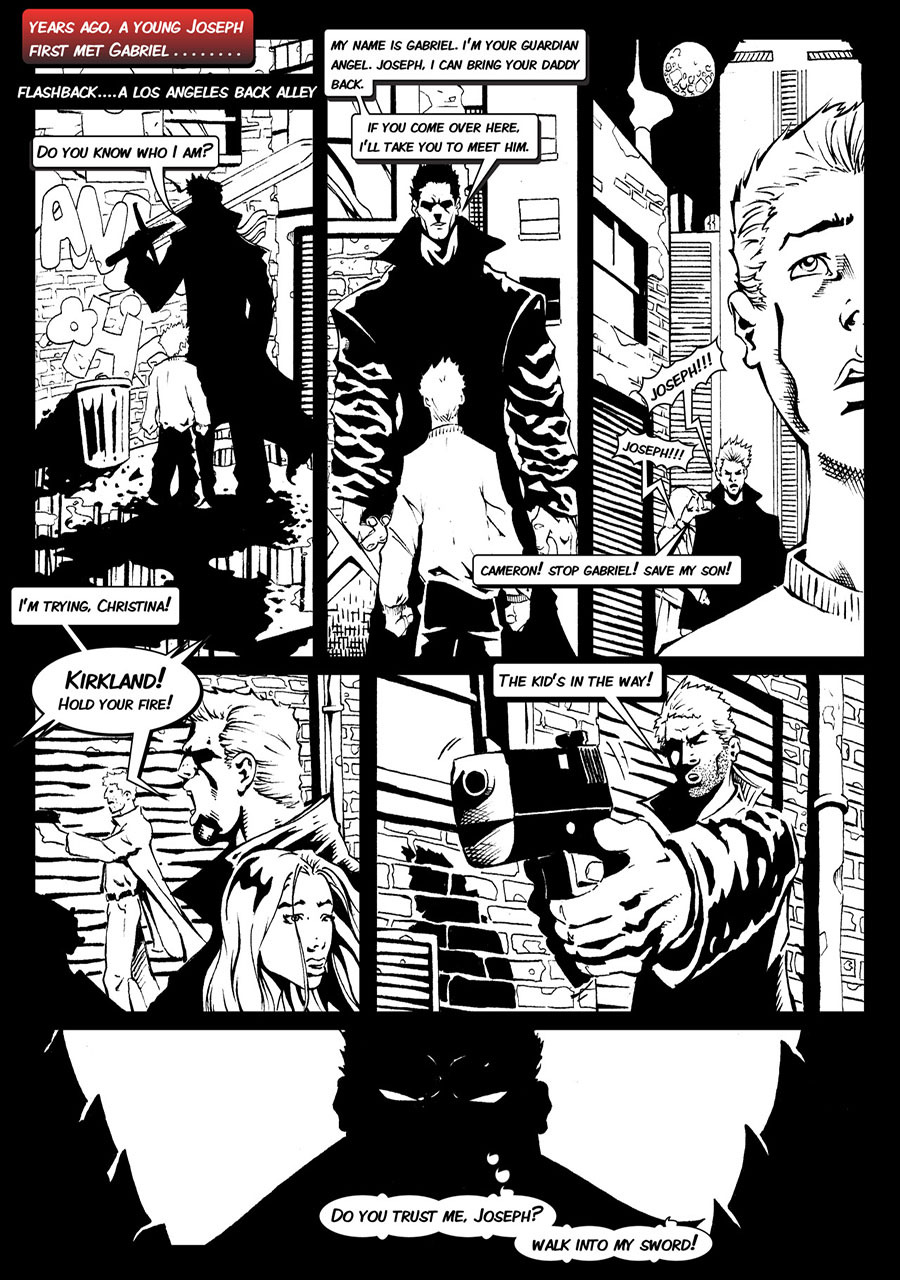 Vampire Guardian Angels: Resurrection: Afterlife, Issue 4, features a resurrected but horribly disfigured Gabriel seeks revenge on Joseph, the little boy whose mysterious power sent him back to Heaven. Flashbacks tell the story of how Cameron accidentally killed Joseph's mother and how Joseph was bitten by Cameron and is not yet aware that he is a Vampire. A guilt-ridden Cameron and his former detective partner, Kirkland, work to protect a now-adult Joseph from Gabriel.